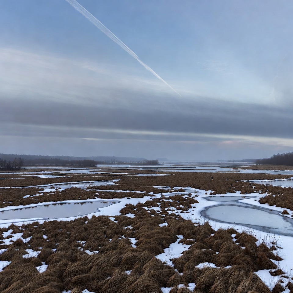 airplane contrail, blue sky, brown grass, clouds, frozen water, horizon, icy pools, landscape, nature, outdoors, snow patches, snowy reeds, trees, wetlands, winter marsh
