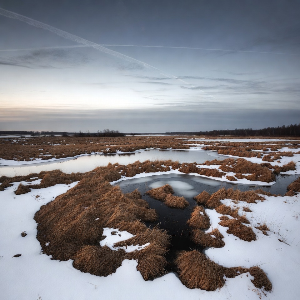 A vast marshland features patches of brown reeds emerging from snow-covered ground and shallow icy pools. The scene stretches to distant dark trees under a cloudy sky with contrails and soft twilight hues. The landscape appears serene and expansive in winter.
