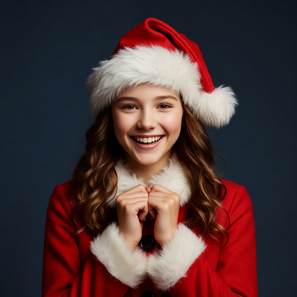 A young girl with long curly brown hair smiles happily while wearing a fluffy red Santa hat and matching red coat with white fur trim. She clasps her hands together in front of her chest against a dark blue background. Her cheerful expression and holiday attire are prominently featured.