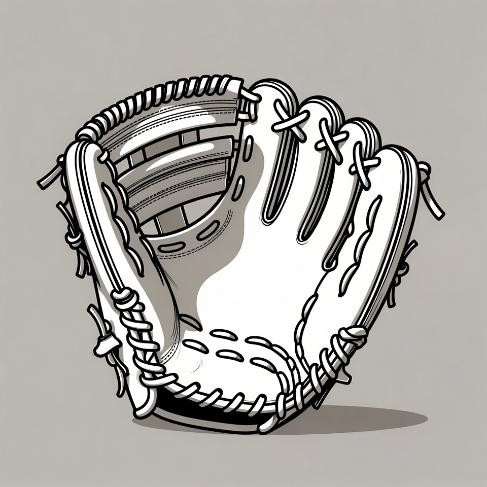 A detailed line art illustration of an open white baseball glove on a gray background. The glove features intricate stitching, laces, and webbing, with subtle shading for depth. It is depicted in a realistic style with shadows beneath.