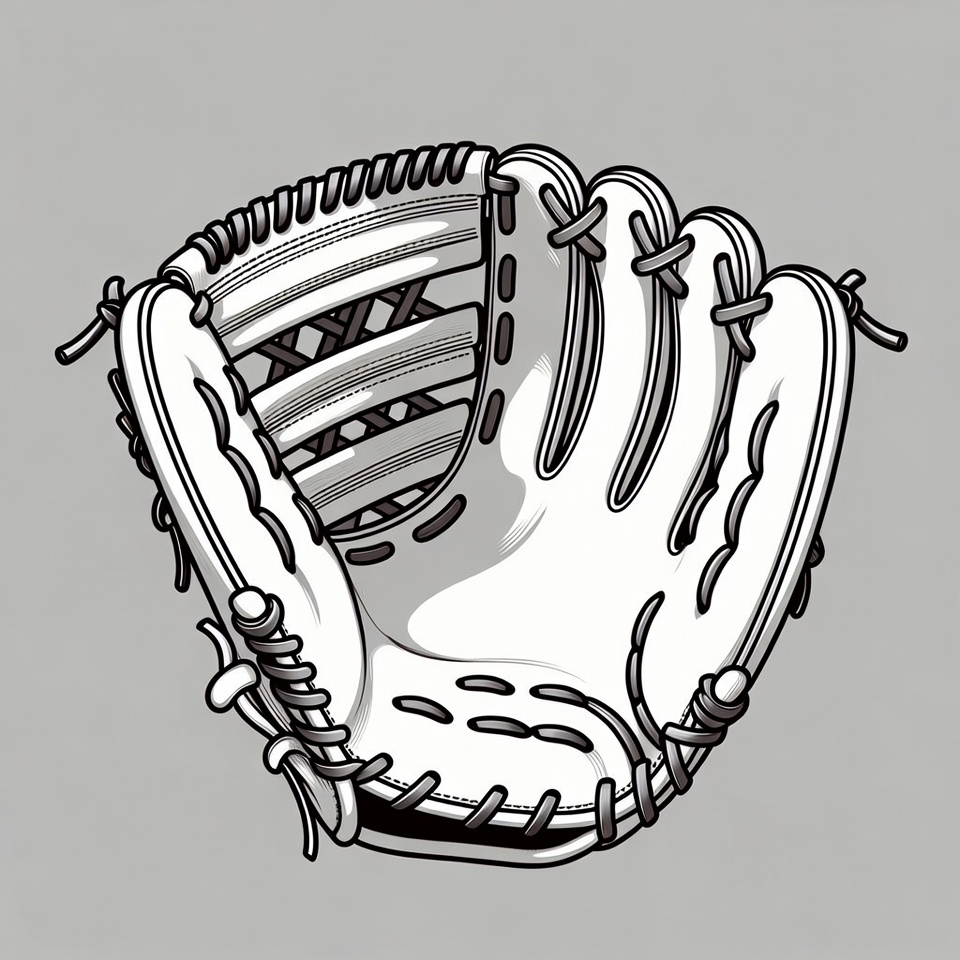 A detailed line art illustration of a white baseball glove is shown from the palm side. The glove features intricate stitching, laces, and webbing in black outlines against a light gray background. It is depicted in a realistic style with shading for depth.