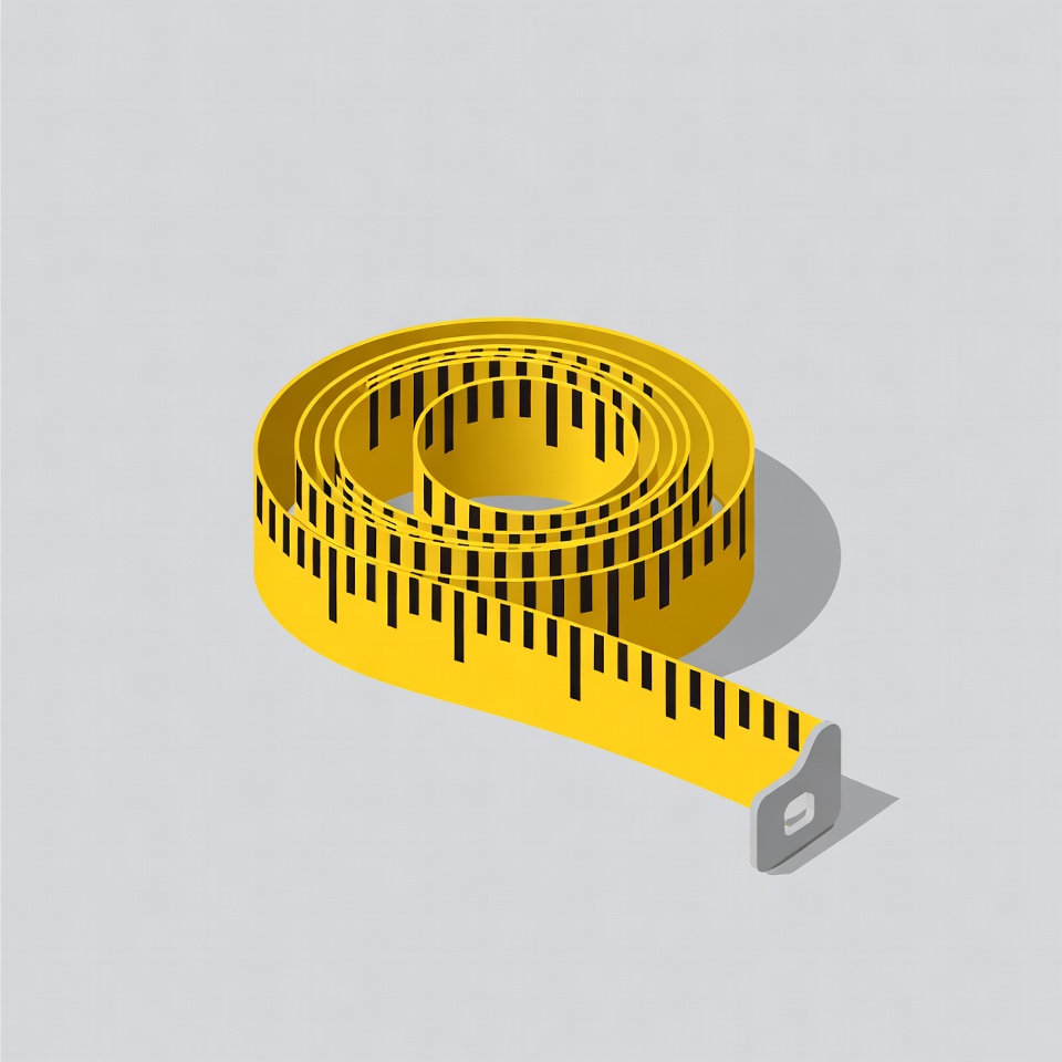 A yellow measuring tape with black measurement markings is coiled on a light gray background. The tape features a metallic end tab and subtle shadow for depth. It is rendered in a clean, flat illustration style.