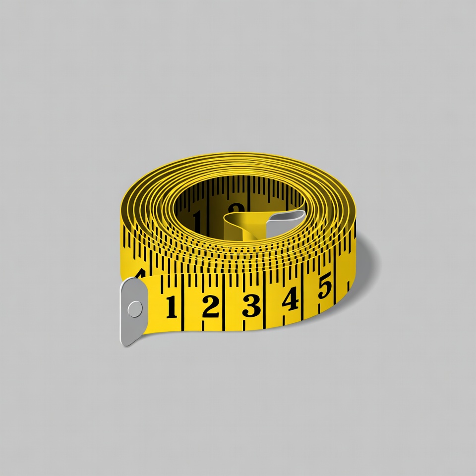 A yellow measuring tape is coiled in a circular shape on a gray background. The tape features black measurement markings including numbers from 1 to 5. It is depicted as a 3D illustration with a metallic clasp.