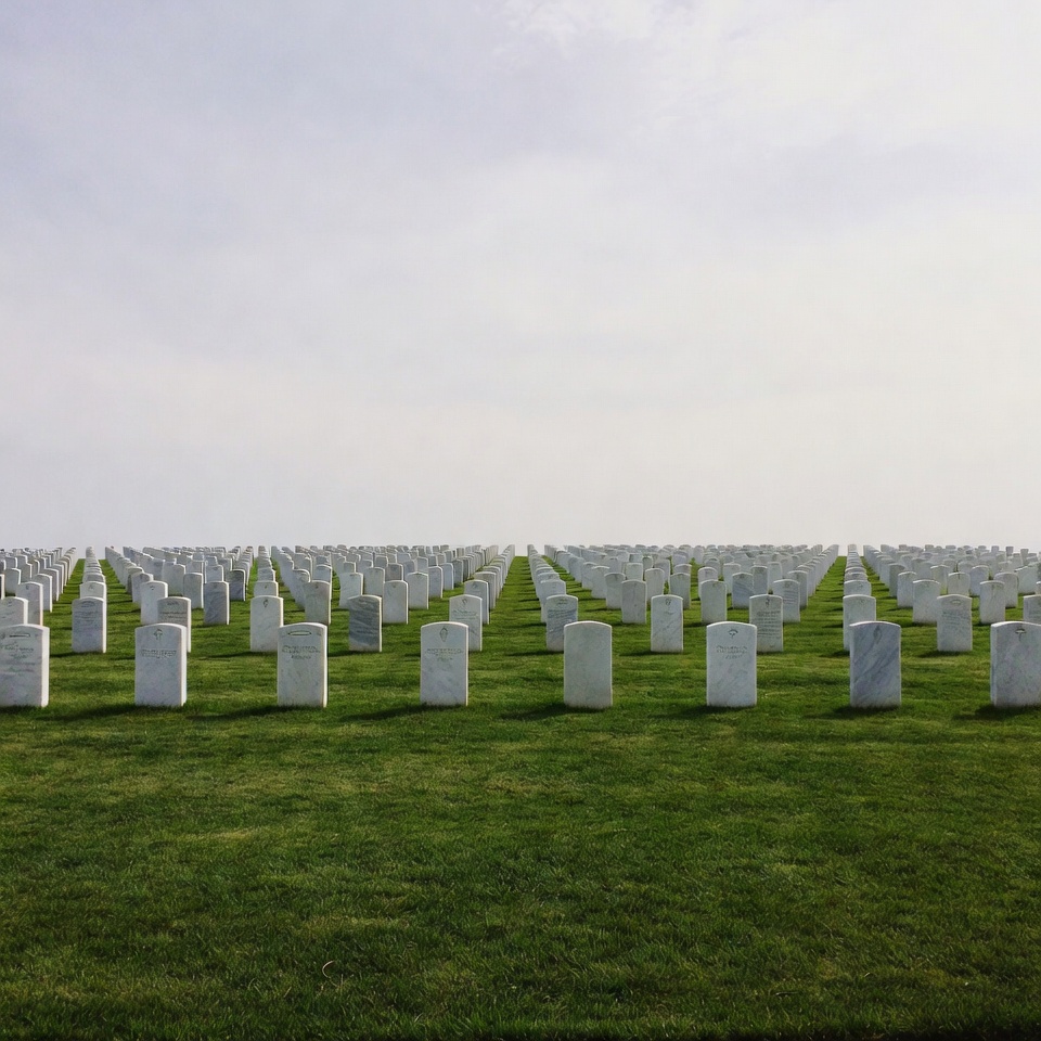Rows of White Headstones in Cemetery