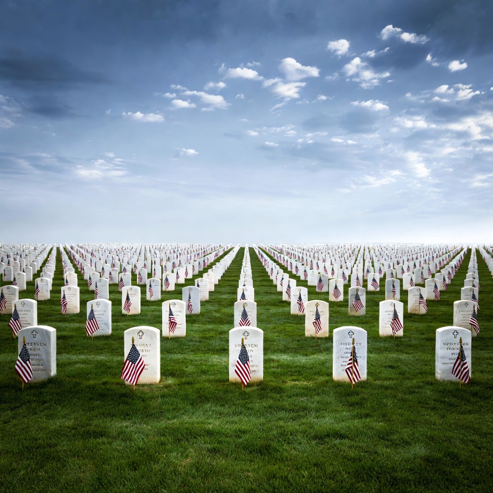 Rows of white gravestones topped with small American flags extend across a vast green lawn in a cemetery. The scene is captured under a partly cloudy sky with dramatic lighting. The flags wave gently, creating a symmetrical pattern leading to the horizon.
