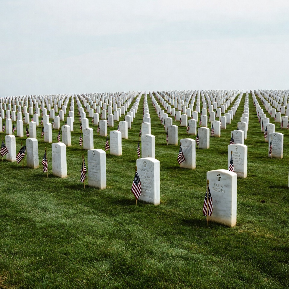 A large field of white gravestones arranged in precise rows stretches across a grassy landscape under a cloudy sky. Many gravestones are adorned with small American flags planted in the ground nearby. The cemetery appears expansive, emphasizing uniformity and solemnity.