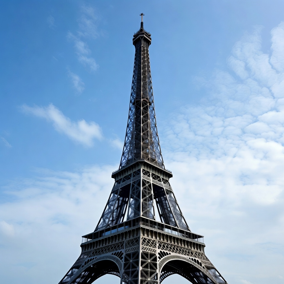 European landmark, France, Paris landmark, architecture, blue sky, famous monument, iconic building, iron tower, lattice design, sunny day, tall structure, tourist attraction, travel, white clouds, Eiffel Tower