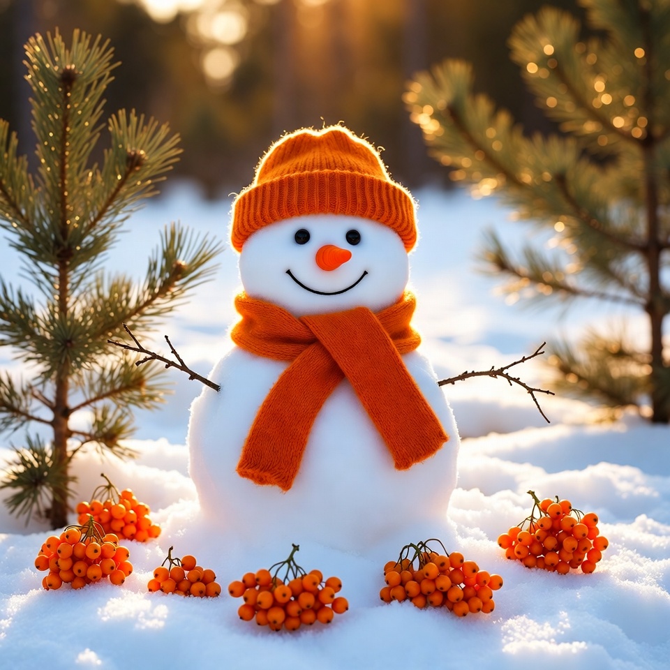 A cheerful snowman with a smiling face stands in snowy forest surrounded by pine trees. It wears an orange knit hat and matching scarf, with clusters of bright red rowan berries scattered around its base on the snow. Golden sunlight filters through the trees in the background.