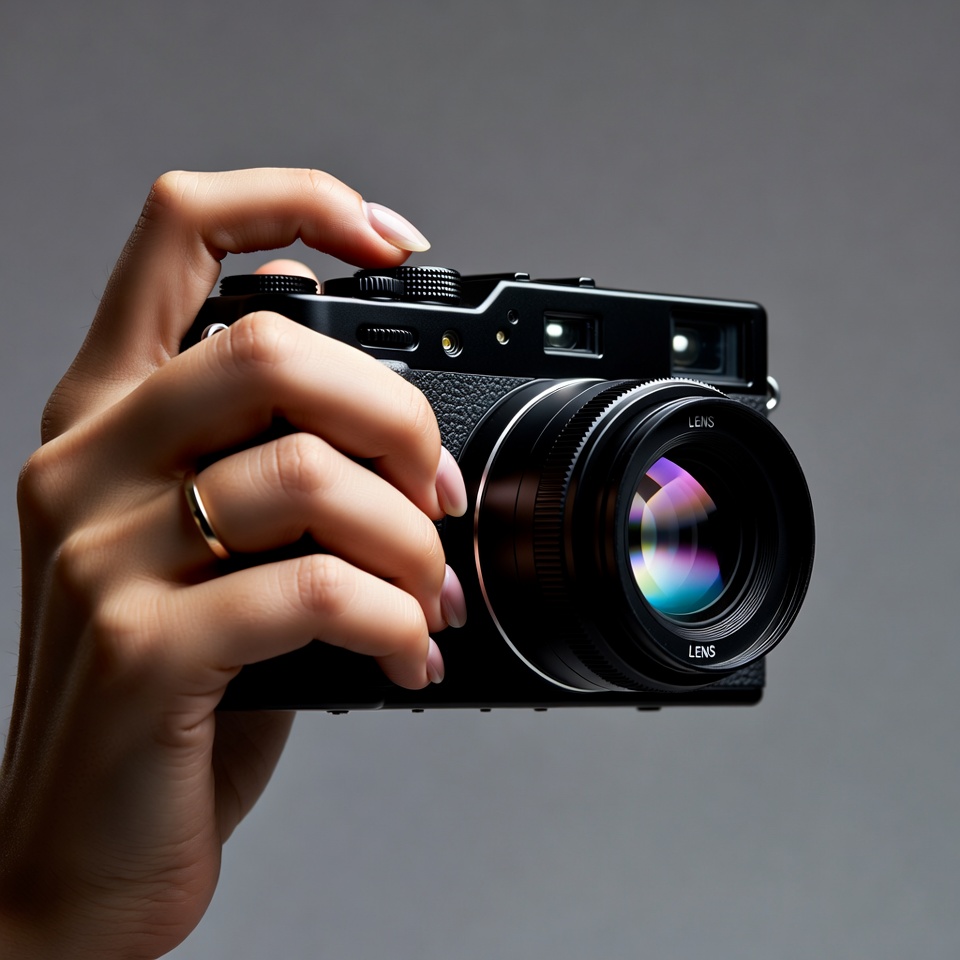 Asian, Leica camera, black camera, camera lens, closeup, digital camera, female, film camera, gold ring, gray background, hand grip, hands, holding camera, isolated background, manicured nails, photo equipment, photography, rangefinder, vintage camera, woman