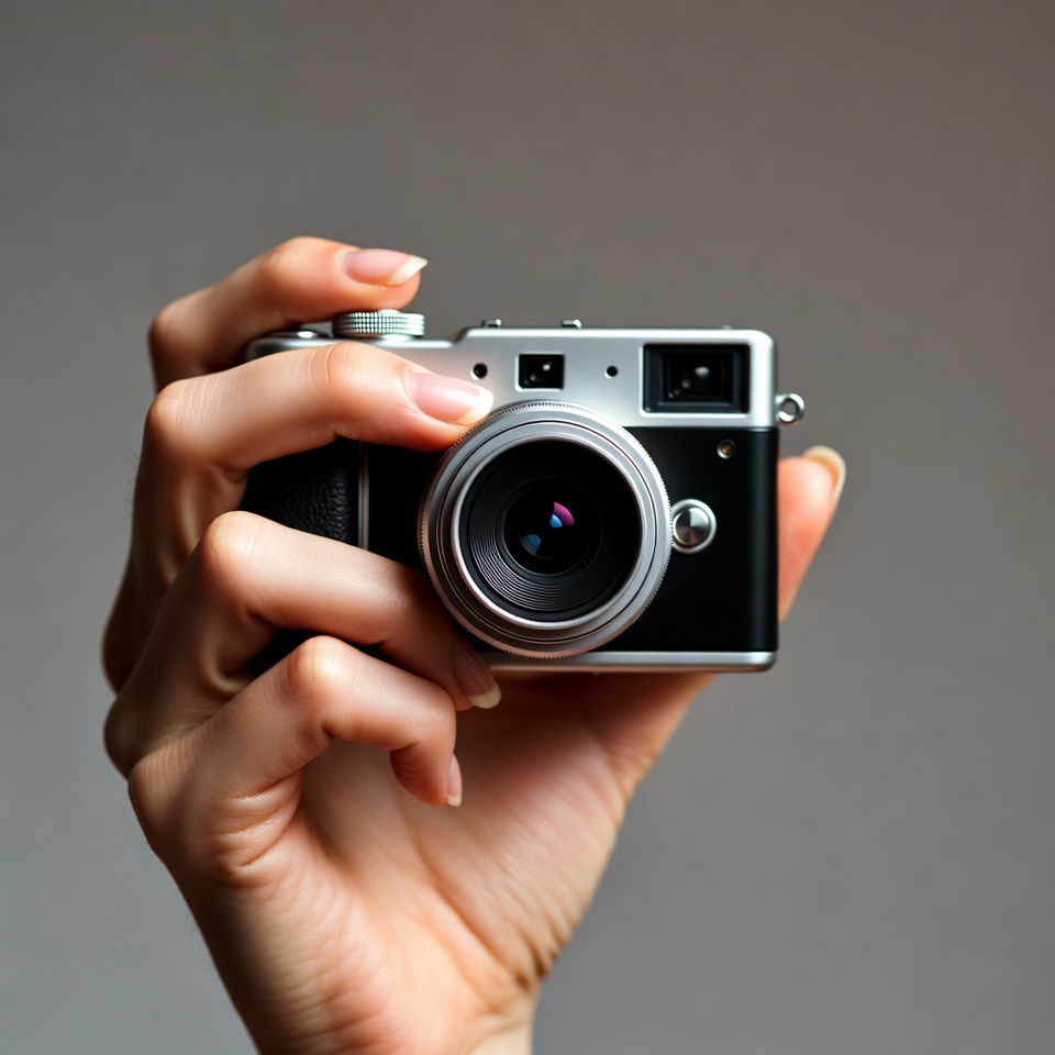 A woman's hand with manicured nails holds a compact silver vintage camera with a prominent lens. The camera features black leather accents and is displayed against a plain gray background. The hand grips the camera firmly, showcasing its details clearly.