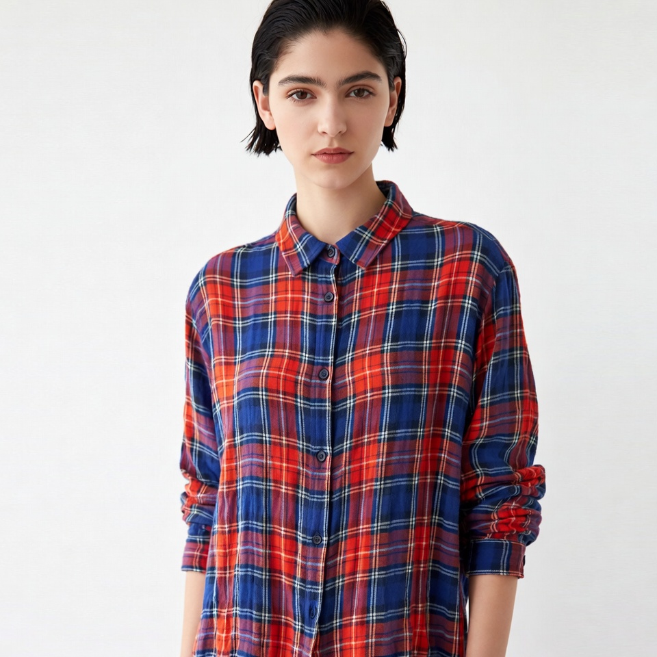 A young woman with short dark hair and Middle Eastern features stands against a white background. She wears a loose-fitting plaid shirt in blue, red, and white checks with long sleeves. Her expression is neutral with direct gaze at the camera.