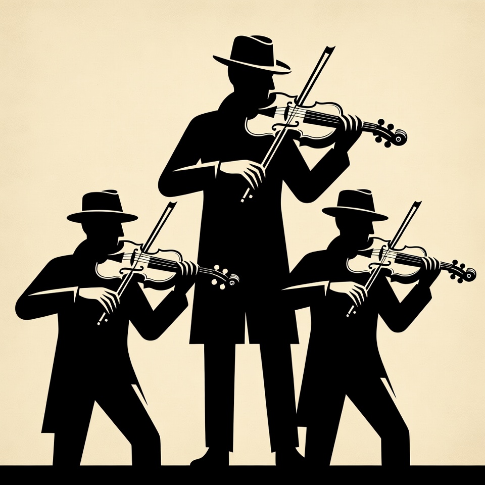 A black silhouette illustration depicts three men wearing fedoras and long coats playing violins. The central tall man stands prominently with a violin at his chin, flanked by two shorter men in similar poses. The figures are set against a beige background with simple line art.