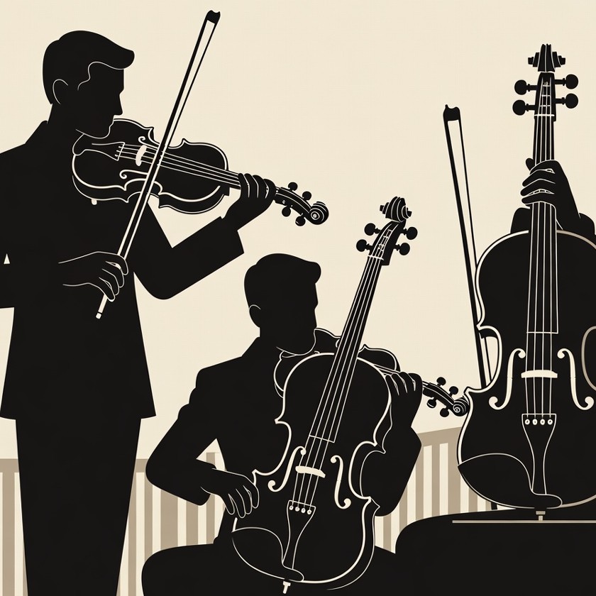 Three male musicians in black silhouettes play string instruments on a light beige background. Two men hold violins with bows, while the third plays a cello seated on a stool. They wear formal suits and are positioned closely together.