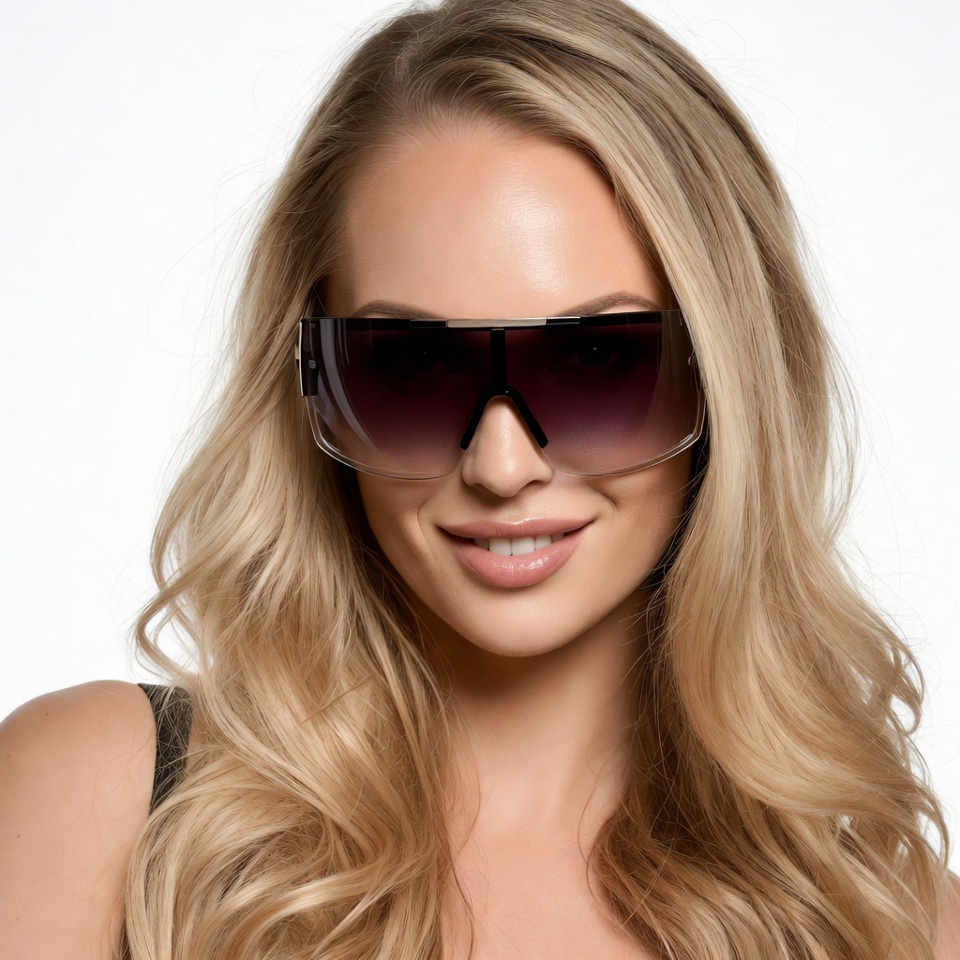 A young woman with long wavy blonde hair smiles while wearing large black-framed sunglasses with gradient lenses. She has fair skin and is dressed in a black top. The image is isolated on a white background.