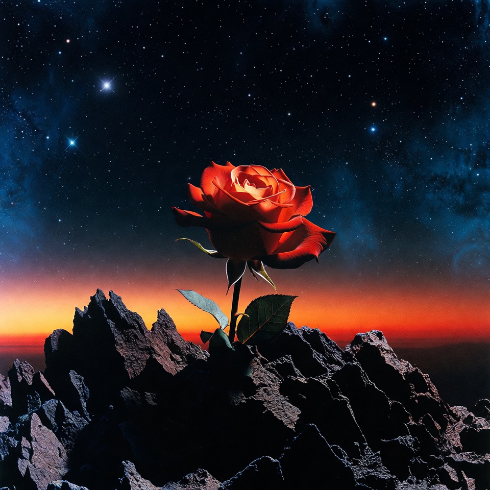 A vibrant red rose grows from a dark rocky mountain peak under a starry night sky. The flower features detailed petals and green leaves, contrasting sharply with the rugged black rocks. Twinkling stars and a cosmic background surround the scene.