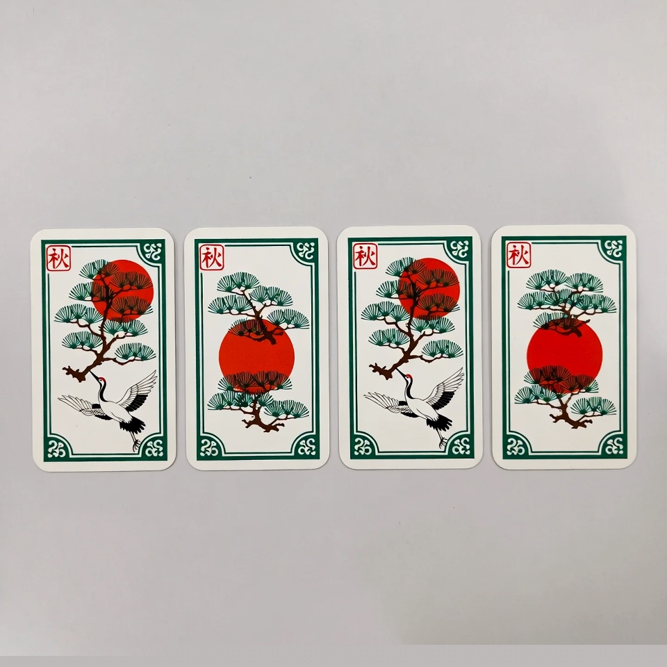 Asian art, Japan, Japanese cards, animals, birds, crane, four cards, green borders, illustration, isolated background, nature, pine tree, playing cards, red sun, rising sun, traditional cards, white crane, Hanafuda cards