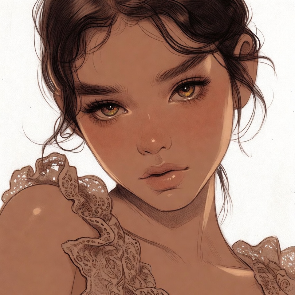 A young Asian girl with wavy dark brown hair gazes at the viewer in a detailed digital illustration. She has striking golden eyes, flushed cheeks, and glossy lips. Her shoulder is adorned with delicate lace fabric against an isolated background.