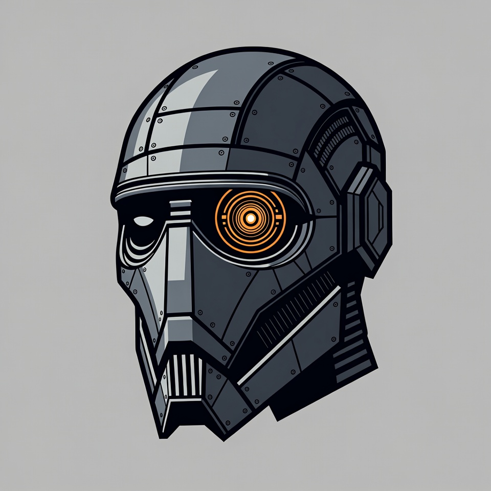 A detailed illustration of a metallic gray robot head in profile view against a gray background. The robot features riveted panels, mechanical joints, and a prominent orange glowing eye with concentric circles. It has a futuristic helmet-like design with ear guards and a grill mouth.
