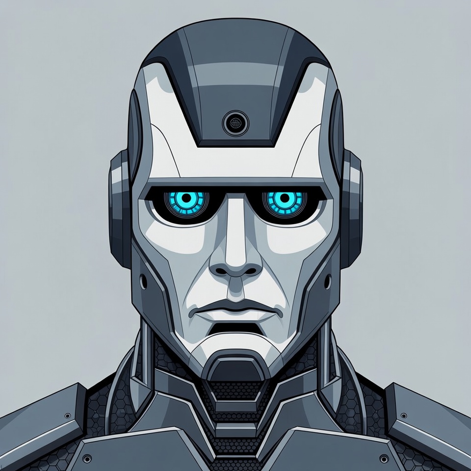 AI robot, android, armor, blue eyes, camera lens, cyberpunk, digital art, futuristic robot, glowing eyes, gray background, illustration, isolated background, machine, metallic, robot head, sci-fi, vector art, robot