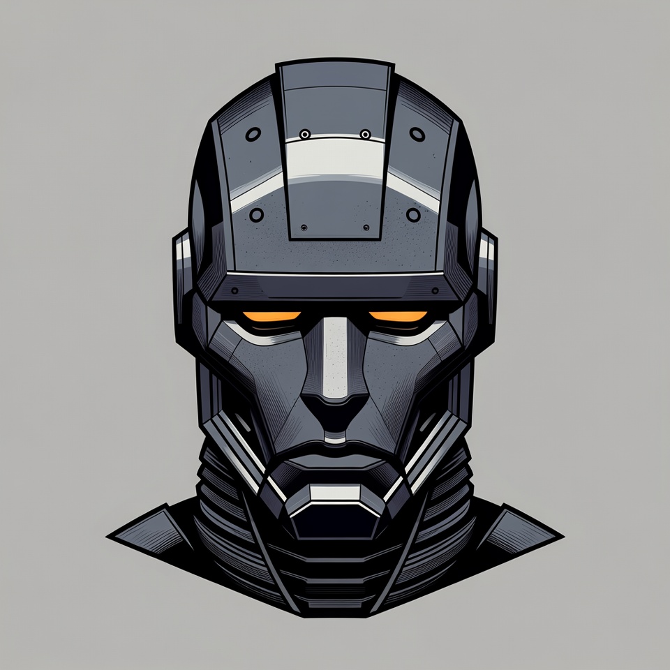 armor design, black helmet, cyberpunk, cyborg head, digital illustration, dystopian robot, futuristic robot, glowing eyes, graphic art, helmet closeup, isolated background, mechanical head, metallic armor, orange eyes, robot face, robot portrait, sci-fi character, sci-fi helmet, vector art, robot helmet