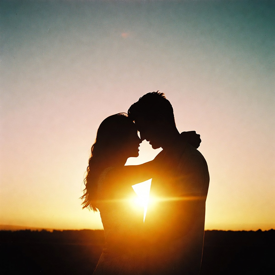 A man and woman stand in silhouette, locked in a close embrace with foreheads touching. The vibrant sunset sky glows behind them with rays of orange and yellow light. They are positioned against a vast open landscape at dusk.
