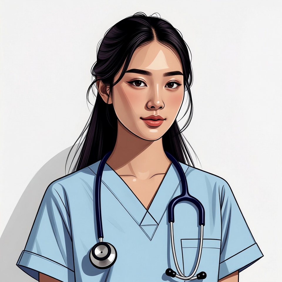 Asian, black hair, blue scrubs, cartoon nurse, digital art, doctor uniform, female, female nurse, healthcare worker, hospital staff, illustration, isolated background, long hair, medical professional, medical uniform, ponytail, portrait, pretty woman, professional, smiling, stethoscope, vector art, woman, young woman, nurse