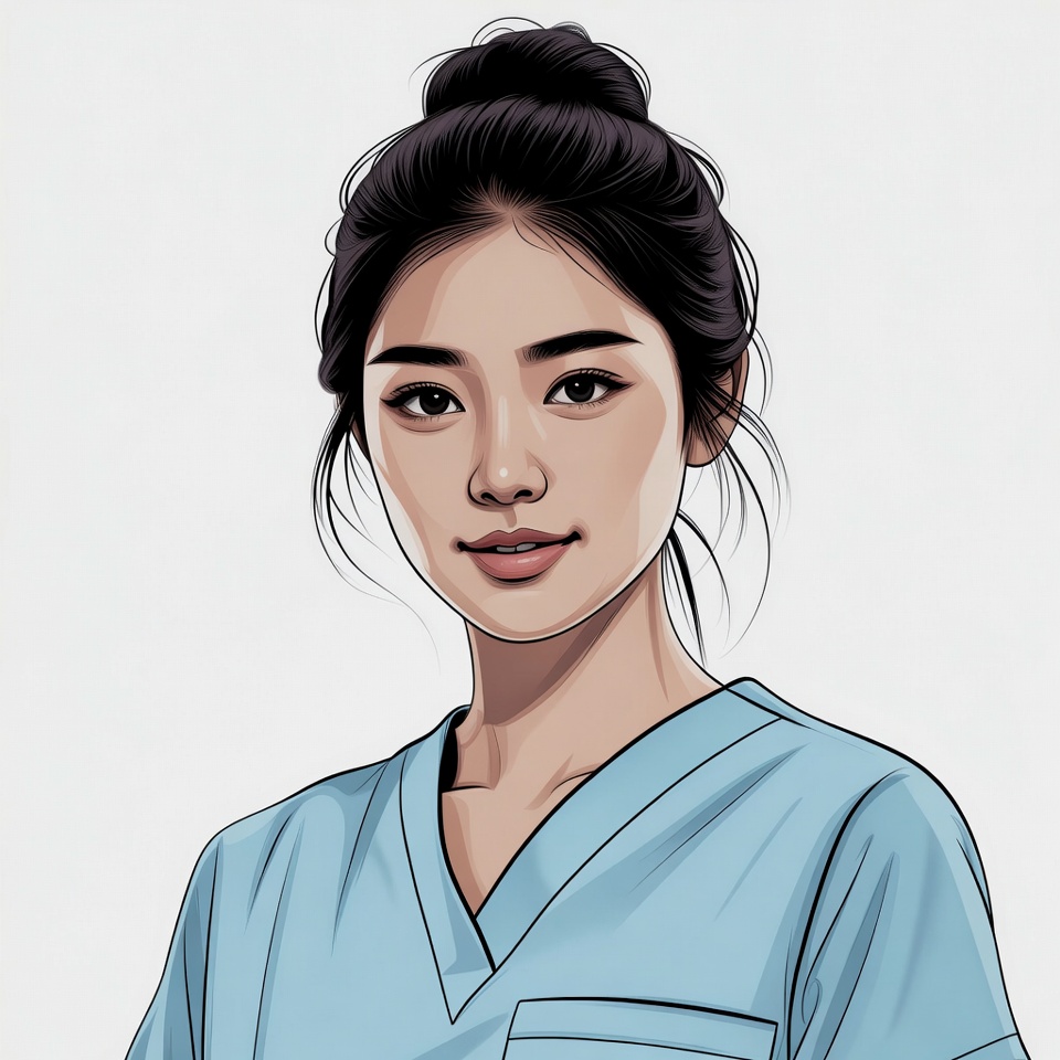 Asian, V-neck scrubs, black hair, blue uniform, bun hairstyle, digital art, female, gentle expression, healthcare worker, illustration, isolated background, medical uniform, pocket detail, portrait, smile, white background, woman, young woman, nurse