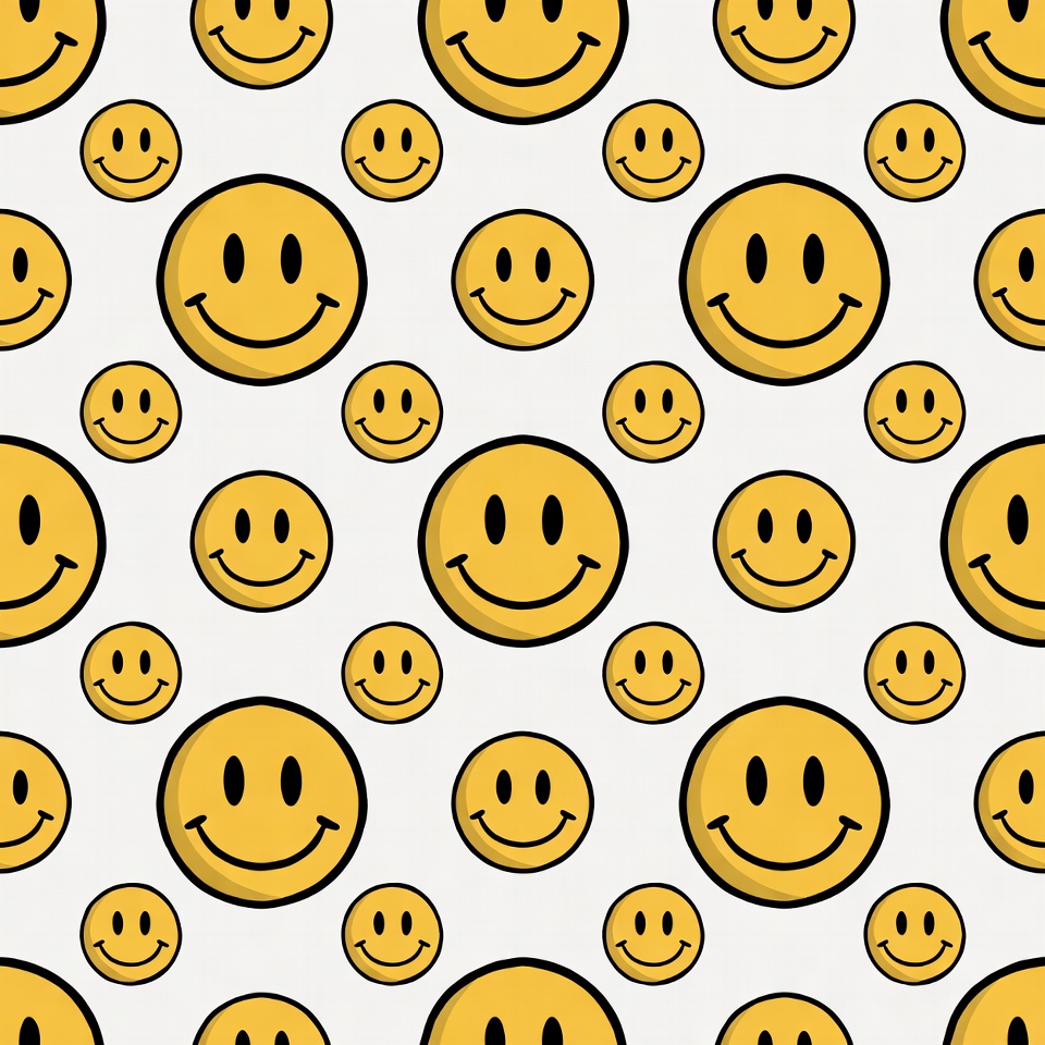 A seamless pattern features numerous yellow smiley faces with black outlines arranged in a repeating grid on a white background. Each smiley face has a cheerful expression with curved eyes and mouth. The design is simple and bold, ideal for digital or print use.