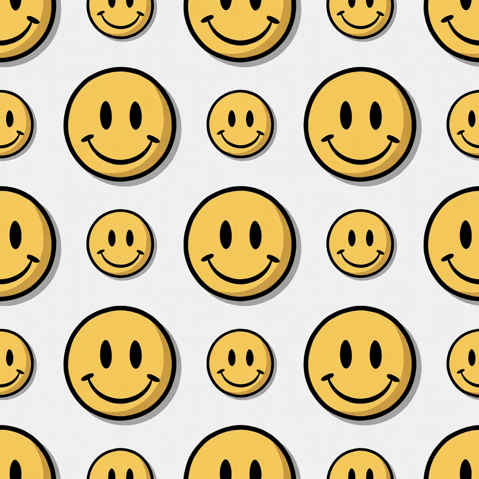 A seamless pattern features numerous yellow smiley faces in various sizes on a white background. The cartoonish faces have black outlines, prominent smiles, and cheerful expressions. They are arranged in a repeating grid layout.