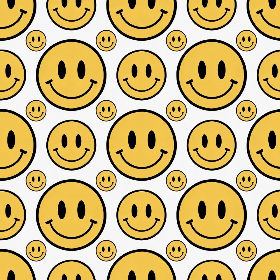 A seamless pattern features numerous yellow smiley faces with black outlines on a white background. Each face has prominent black eyes and a wide curved mouth, arranged in a repeating grid layout. The design is simple, bold, and cartoonish.