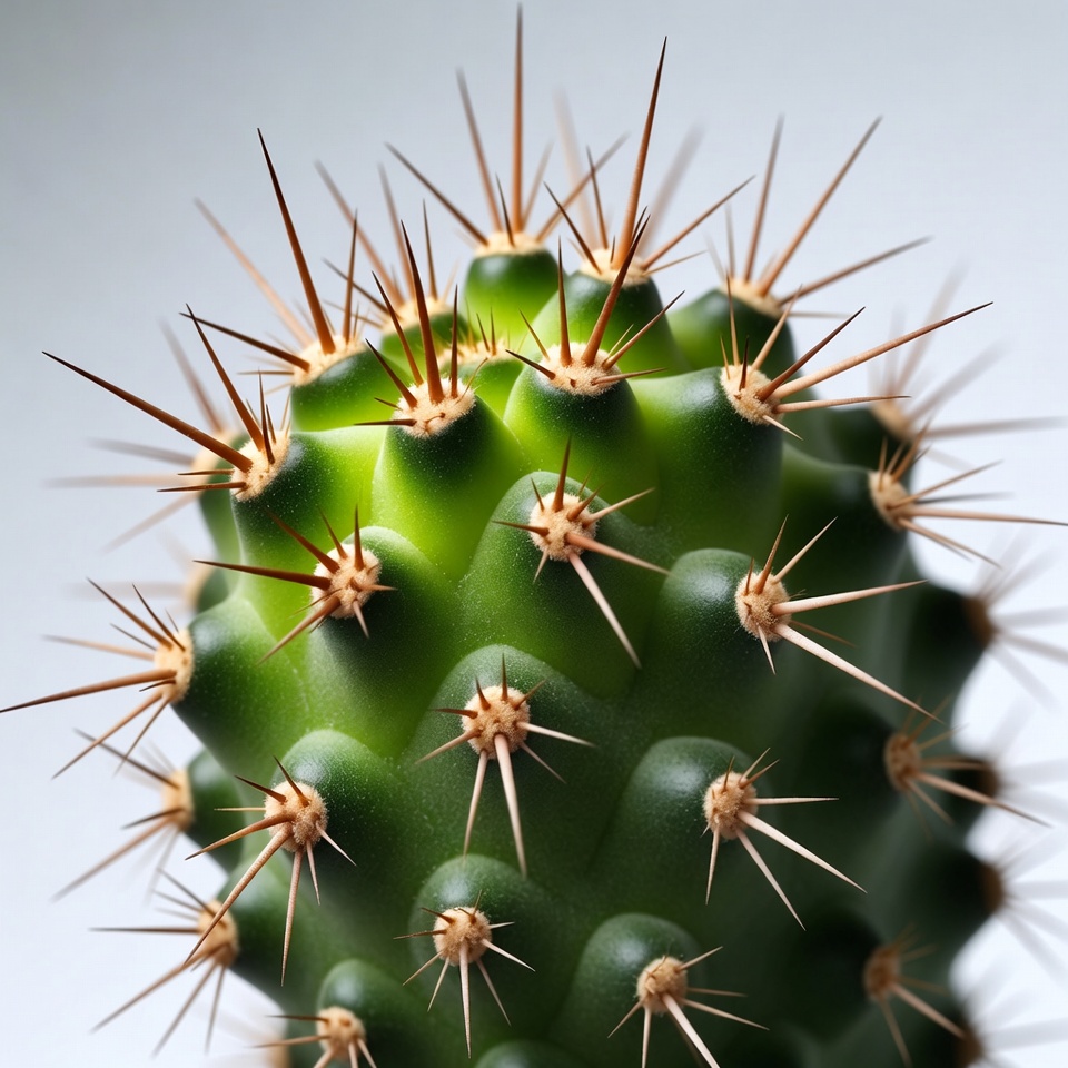 A vibrant green cactus with numerous sharp reddish-brown spines covers its rounded body. The plant features segmented pads and is isolated against a plain white background. Fine details of the spines and subtle textures are visible in close-up.
