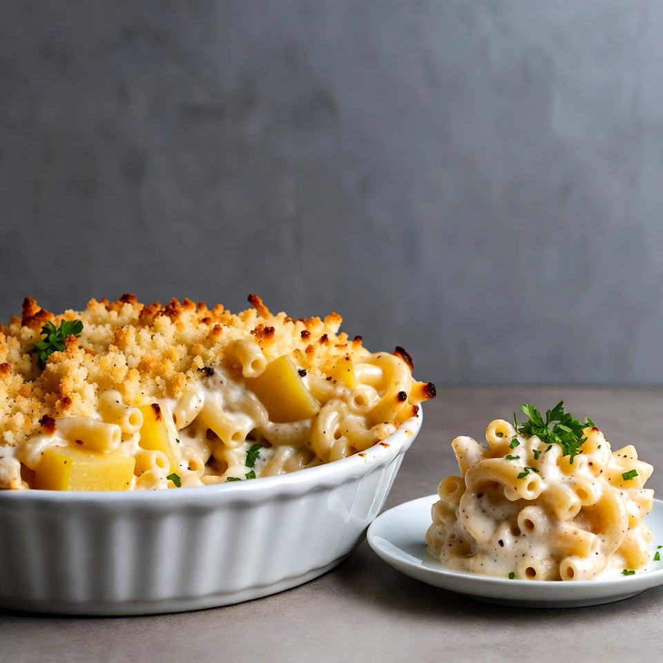 baked pasta, breadcrumb topping, casserole dish, cheese, cheese sauce, cheesy casserole, closeup food, comfort food, creamy pasta, delicious meal, elbow macaroni, food photography, food styling, golden crust, gourmet food, gray background, homemade pasta, macaroni, parsley garnish, pasta, potato chunks, small serving, white dish, white plate, mac and cheese