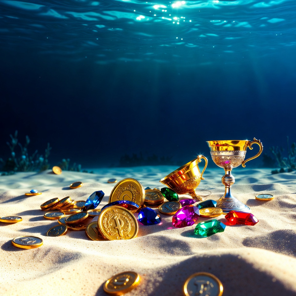 blue water, colorful gems, deep sea, gems, gold coins, gold treasure, golden trophy, illustration, isolated background, jewels, ocean floor, pirate treasure, sandy seabed, seaweed, shiny coins, sunlight rays, treasure chest, underwater treasure