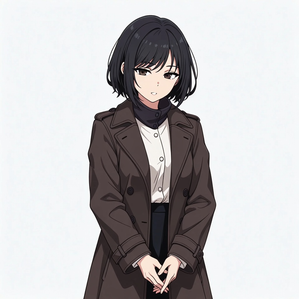 An anime girl with short black bob hair stands with hands clasped in front. She wears a brown trench coat over a white collared shirt and black skirt. The illustration features a plain background and detailed anime-style eyes.