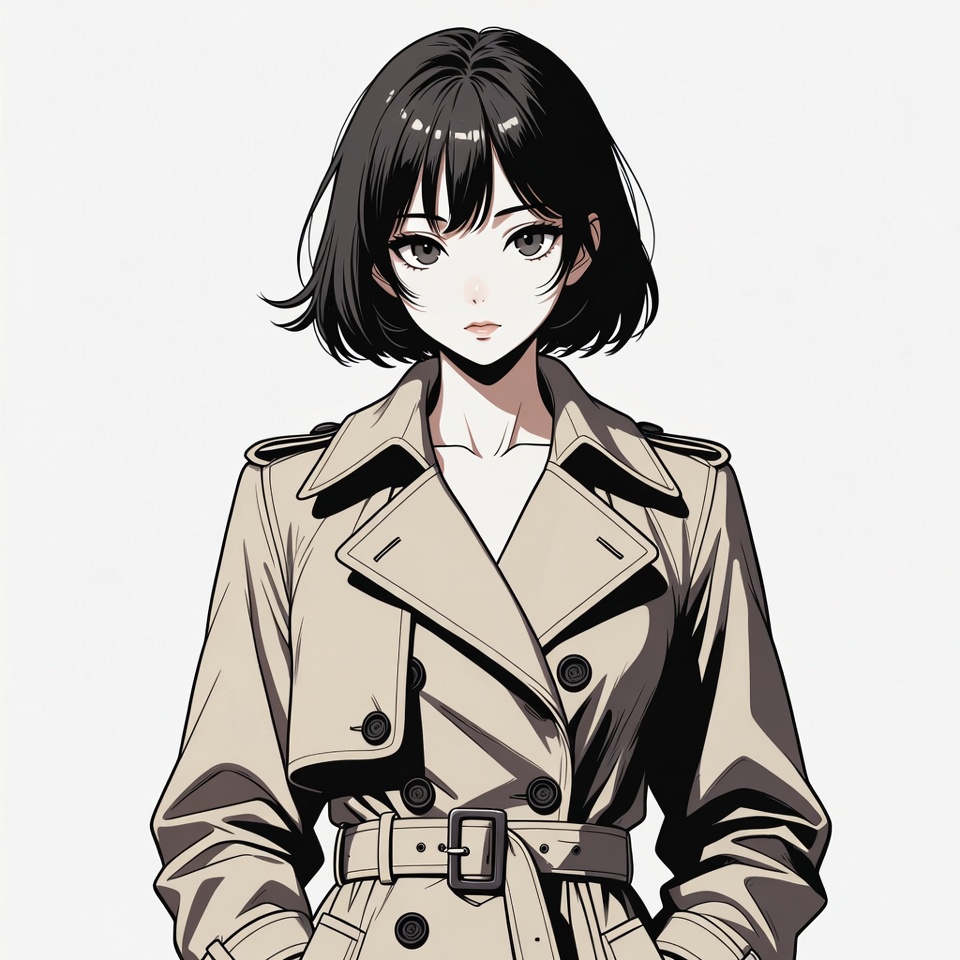 An anime-style illustration of a young woman with short black bob hair and large expressive eyes stands confidently. She wears a long beige trench coat with epaulets, buttons, and a belt, open at the front to reveal a white top underneath. The figure is posed against a plain white background.