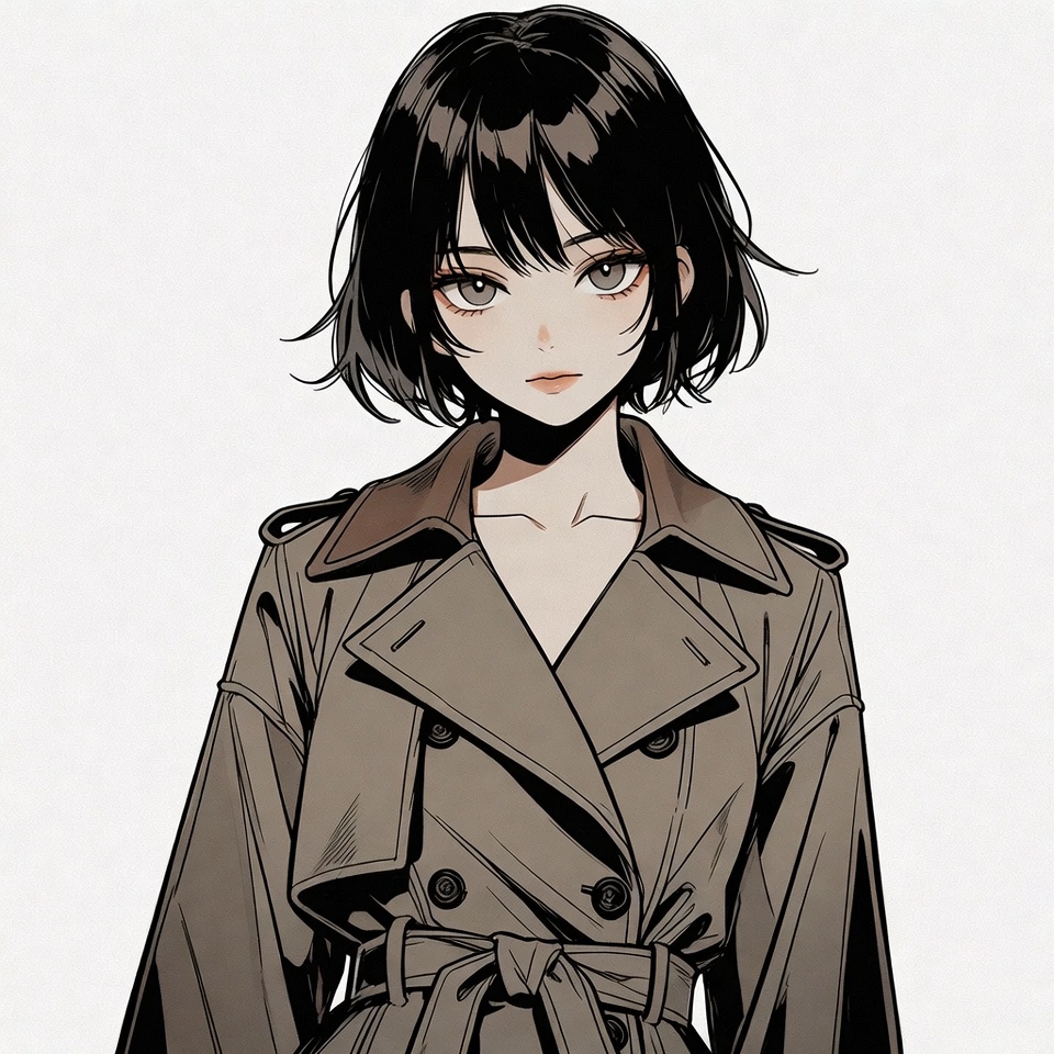 Asian, V-neckline, beige coat, belted coat, collar, confident pose, digital art, double-breasted coat, female, illustration, isolated background, large eyes, manga style, portrait, short black hair, stylish outfit, subtle smile, trench coat, woman, anime girl