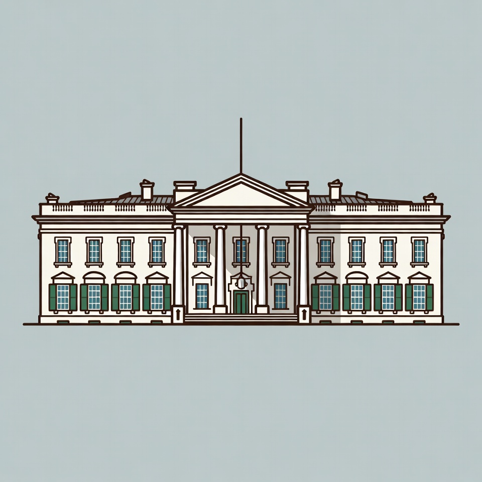 A line art illustration of the White House features the iconic neoclassical building with columns, green shutters on the windows, and chimneys on the roof. The structure is centered with symmetrical wings on both sides and a flagpole at the top. It is depicted on a light gray background in a minimalist style.