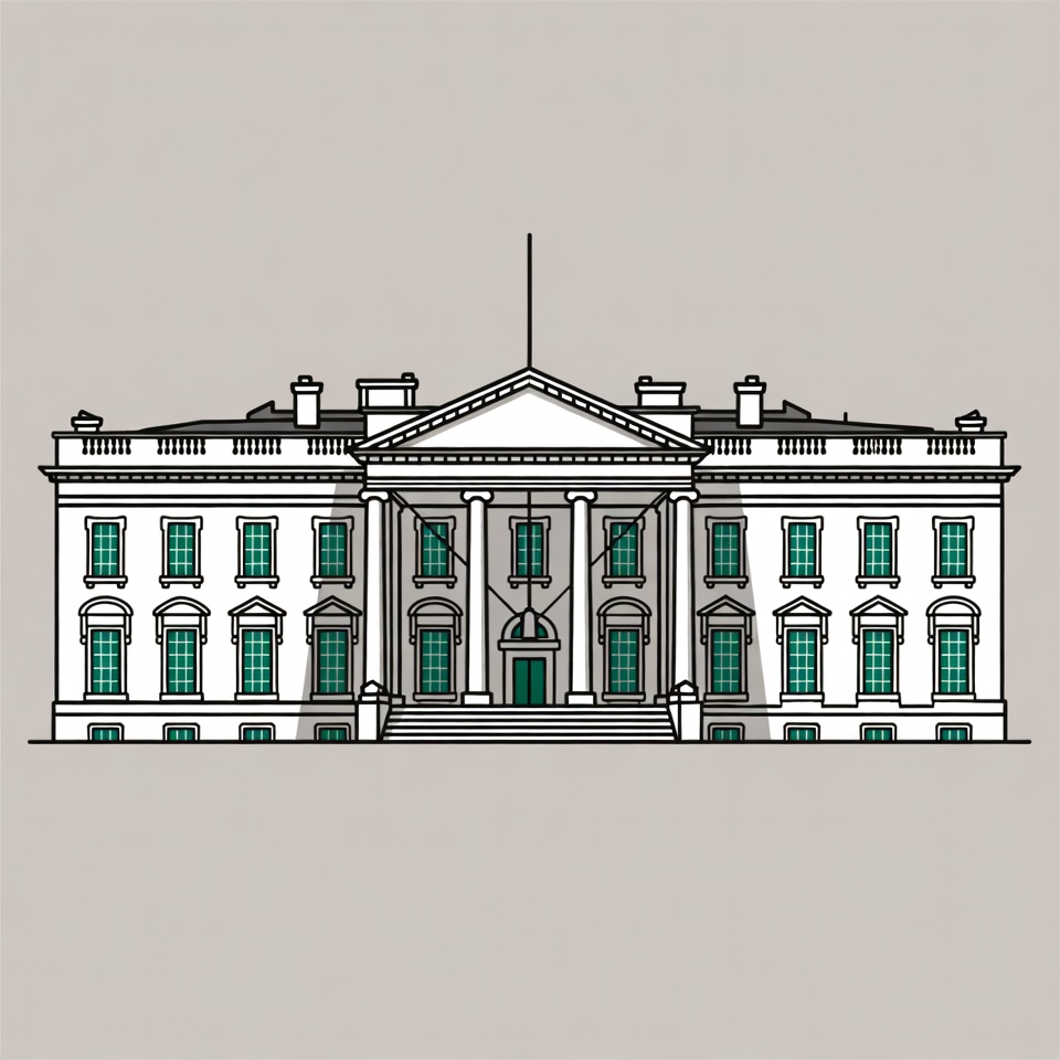 A line art illustration of the White House features the iconic neoclassical building with columns, multiple windows, and a central entrance. The structure is depicted in white outlines against a light gray background, with green shutters on the windows and a flagpole on top. The design emphasizes symmetry and architectural details like the pediment and steps.