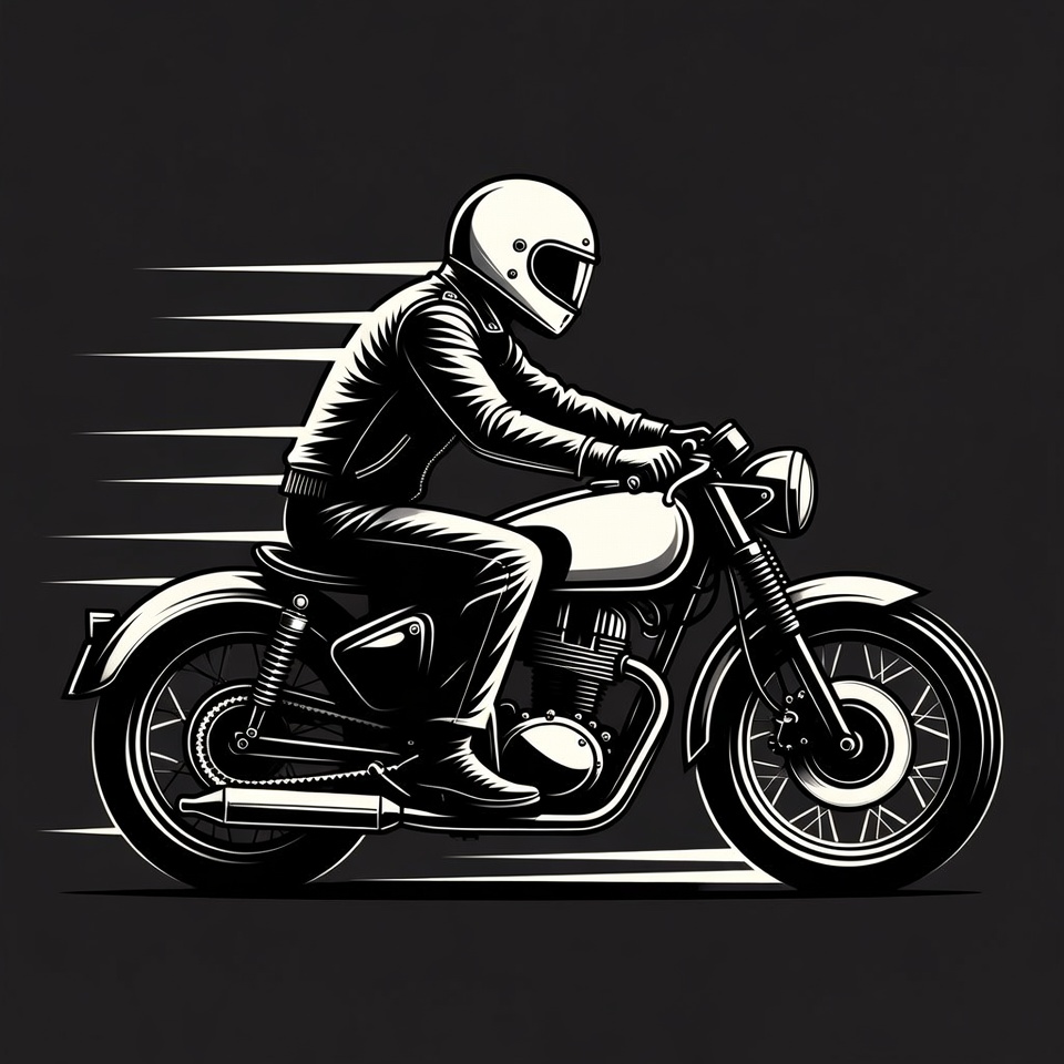 A black and white line art illustration depicts a man wearing a white helmet and leather jacket riding a classic motorcycle at high speed. Motion lines emphasize the fast movement, with detailed views of the bike's wheels, headlight, and exhaust. The image features a dark background and isolated white subject.