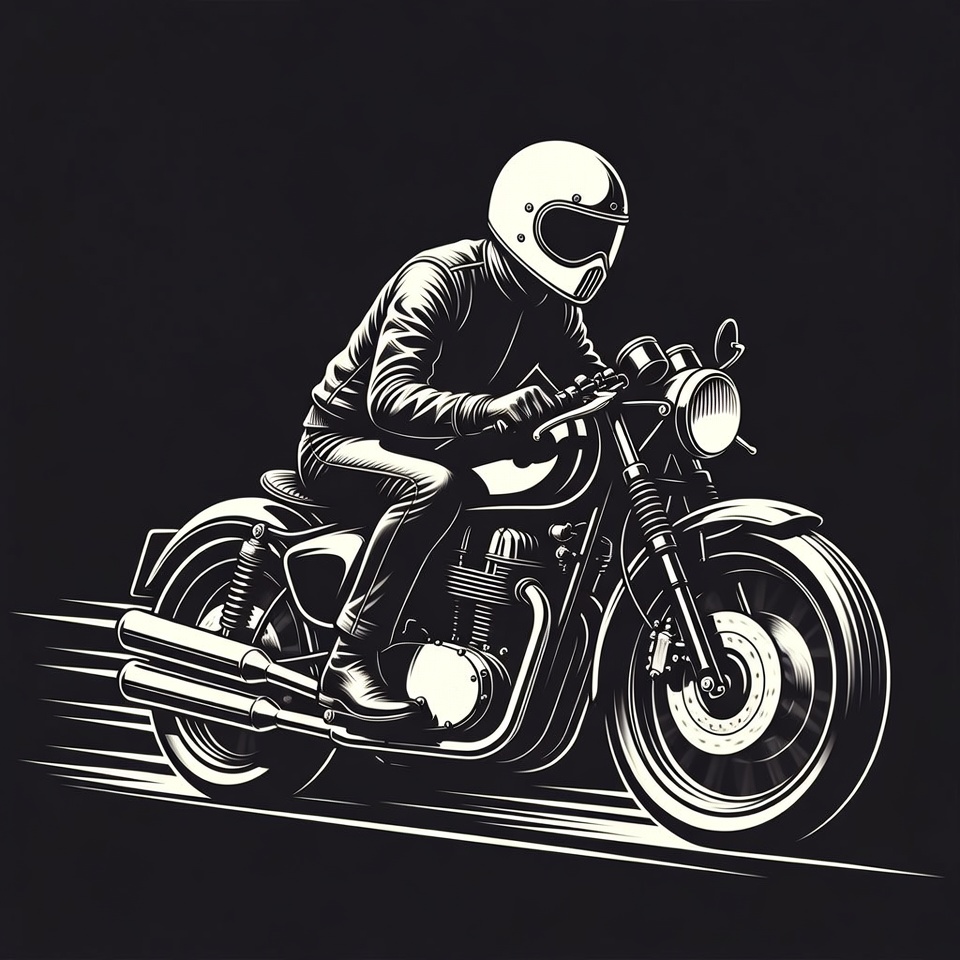 A black and white line art illustration depicts a man wearing a white full-face helmet, leather jacket, pants, and boots riding a classic motorcycle. He leans forward dynamically with motion lines suggesting speed on a dark background. The motorcycle features round headlights, exhaust pipes, and detailed wheels.