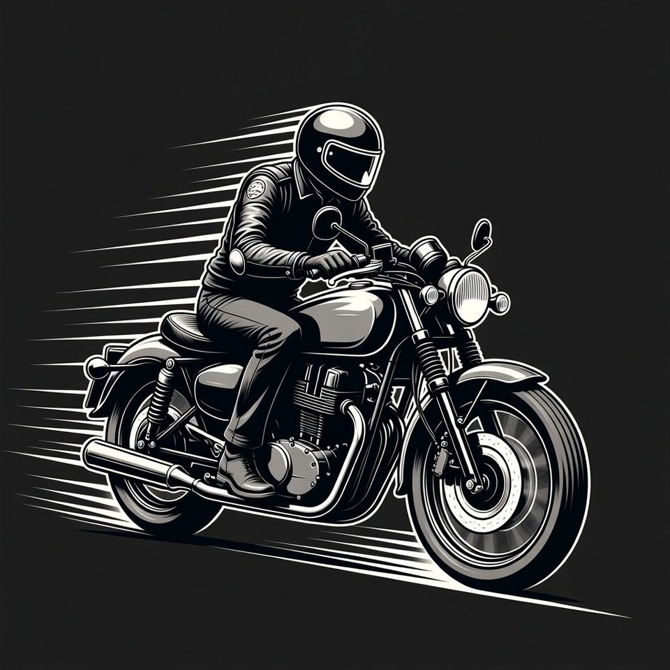 A black and white illustration depicts a man wearing a helmet and leather jacket riding a classic motorcycle at high speed. Motion lines emphasize the dynamic forward movement, with details on the bike's exhaust, wheels, and handlebars. The image is set against an isolated dark background.