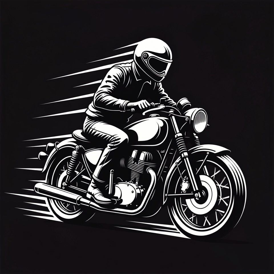 A black and white line art illustration depicts a man wearing a helmet, leather jacket, and pants riding a classic motorcycle. He leans forward dynamically with motion lines emphasizing speed. The motorcycle features a round headlight, exposed engine, and detailed wheels on an isolated black background.