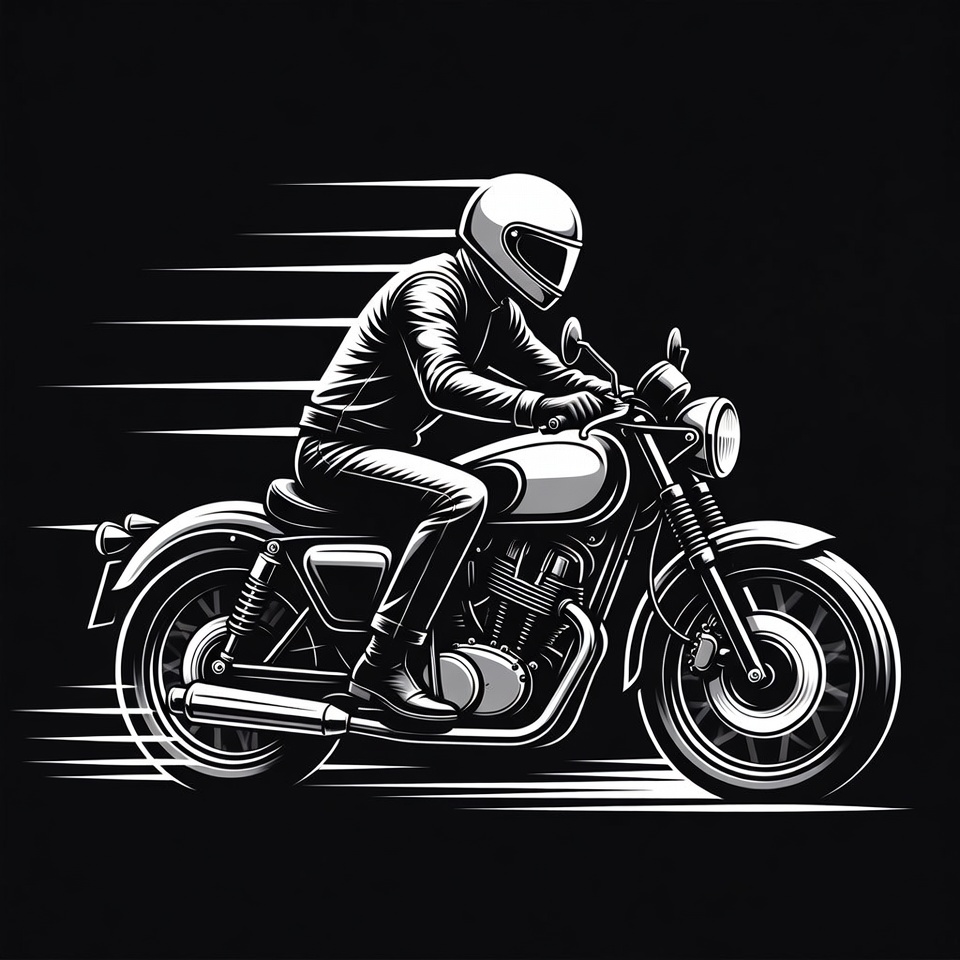 A black and white illustration depicts a man wearing a white helmet and leather jacket riding a classic motorcycle at high speed. Motion blur lines emphasize the fast movement against an isolated black background. The detailed vector art shows the rider leaning forward with handlebars and exhaust visible.