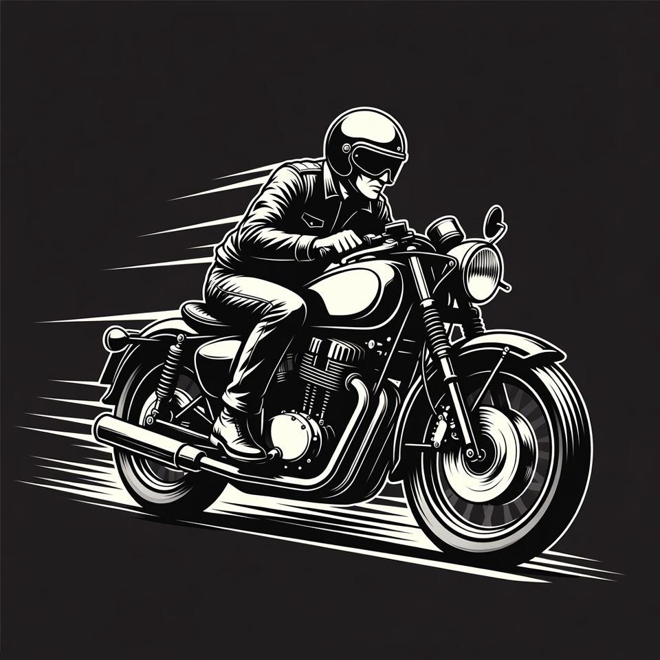 A black and white illustration depicts a man wearing a helmet, leather jacket, and pants riding a classic motorcycle at high speed. The motorcycle features detailed elements like headlights, exhaust pipe, and wheels, with motion lines emphasizing speed. The image is rendered in a vintage line art style on a dark background.