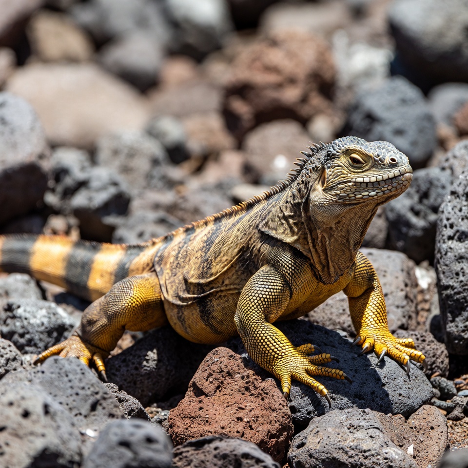 A large Galapagos iguana with yellow and brown scales sits on a rocky terrain of dark volcanic stones. Its spiny crest runs along its back, and it has a striped tail with orange and black bands. The iguana gazes forward with detailed facial features against the rugged lava rock background.