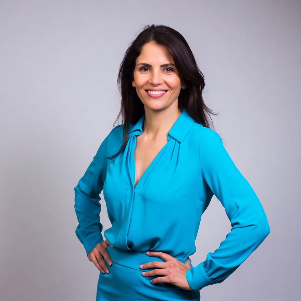 Latina, Middle Eastern, V-neck, blue blouse, collared shirt, confident pose, dark hair, female, gray background, hands on hips, headshot, long hair, portrait, professional, smiling, turquoise outfit, woman