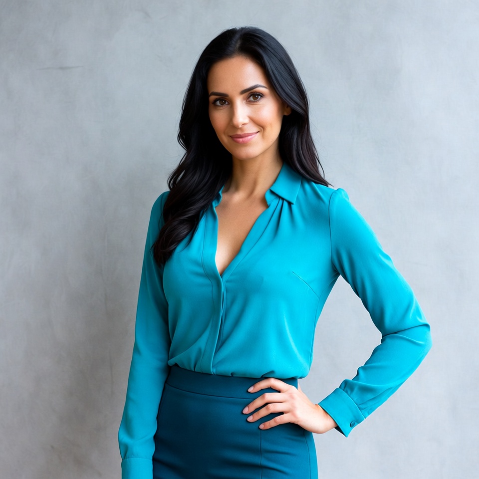 A smiling Latina woman with long dark wavy hair stands confidently against a gray background. She wears a turquoise long-sleeved blouse with a deep V-neck and a fitted black skirt. Her hand rests on her hip while she gazes at the camera.