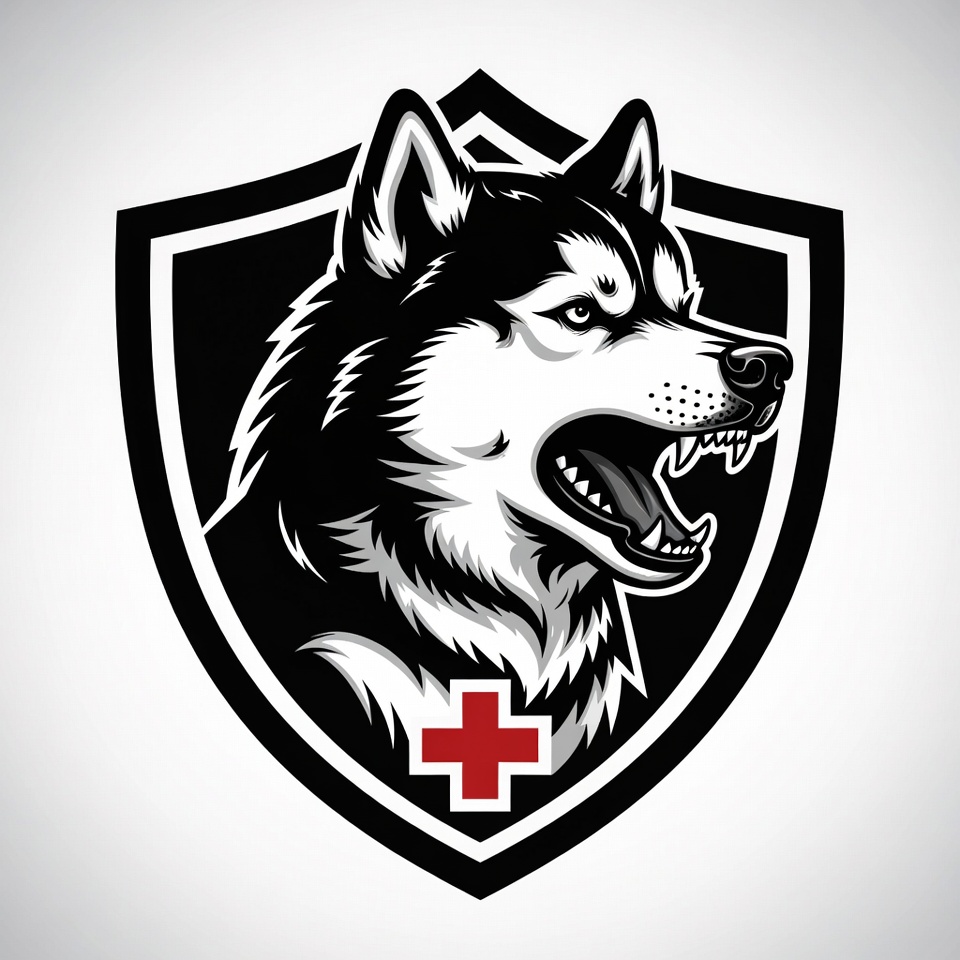 animal logo, badge design, black dog, black shield, canine illustration, clipart, dog head, fierce dog, growling husky, isolated background, medical symbol, red cross, shield emblem, siberian husky, snarling dog, vector art, white dog, husky dog