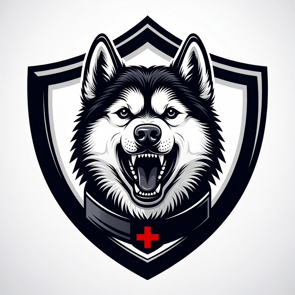 Siberian husky, aggressive dog, animal illustration, badge, black fur, canine, clipart, dog collar, dog head, illustration, isolated background, logo, mascot, medical symbol, red cross, sharp teeth, shield emblem, snarling dog, vector art, white fur, husky dog