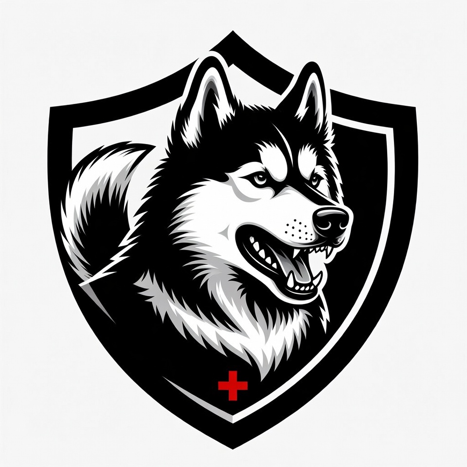 Siberian Husky, animal mascot, black white illustration, canine illustration, dog head, dog logo, emblem badge, fierce husky, graphic design, isolated background, medical cross, red cross, shield emblem, shield logo, snarling dog, vector art, wolf-like dog, husky dog